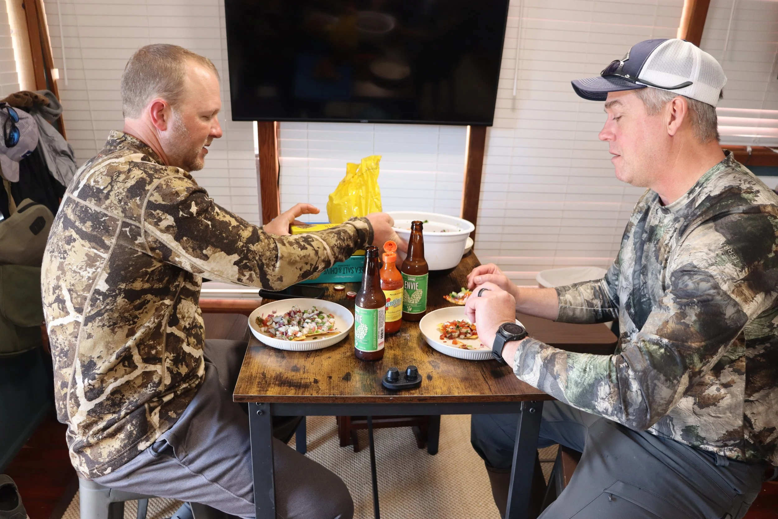 Traveling light we opted to eat our evening meals at the restaurant inside the marina. This would provide an opportunity to get the full experience through local cuisine. Hunters and fishers abounded along the wooden sidewalks through the neighborhood and more gathered in the outdoor bar attached to the restaurant. Stories of success could not be drowned out by the rain as this community gathered to drink, eat, and be social. Wanting to try something I’d never had an attempt to order snapper throats was made. They were out so I settled for some fresh local fried fish. Exhausted and satisfied we headed back to the houseboat.