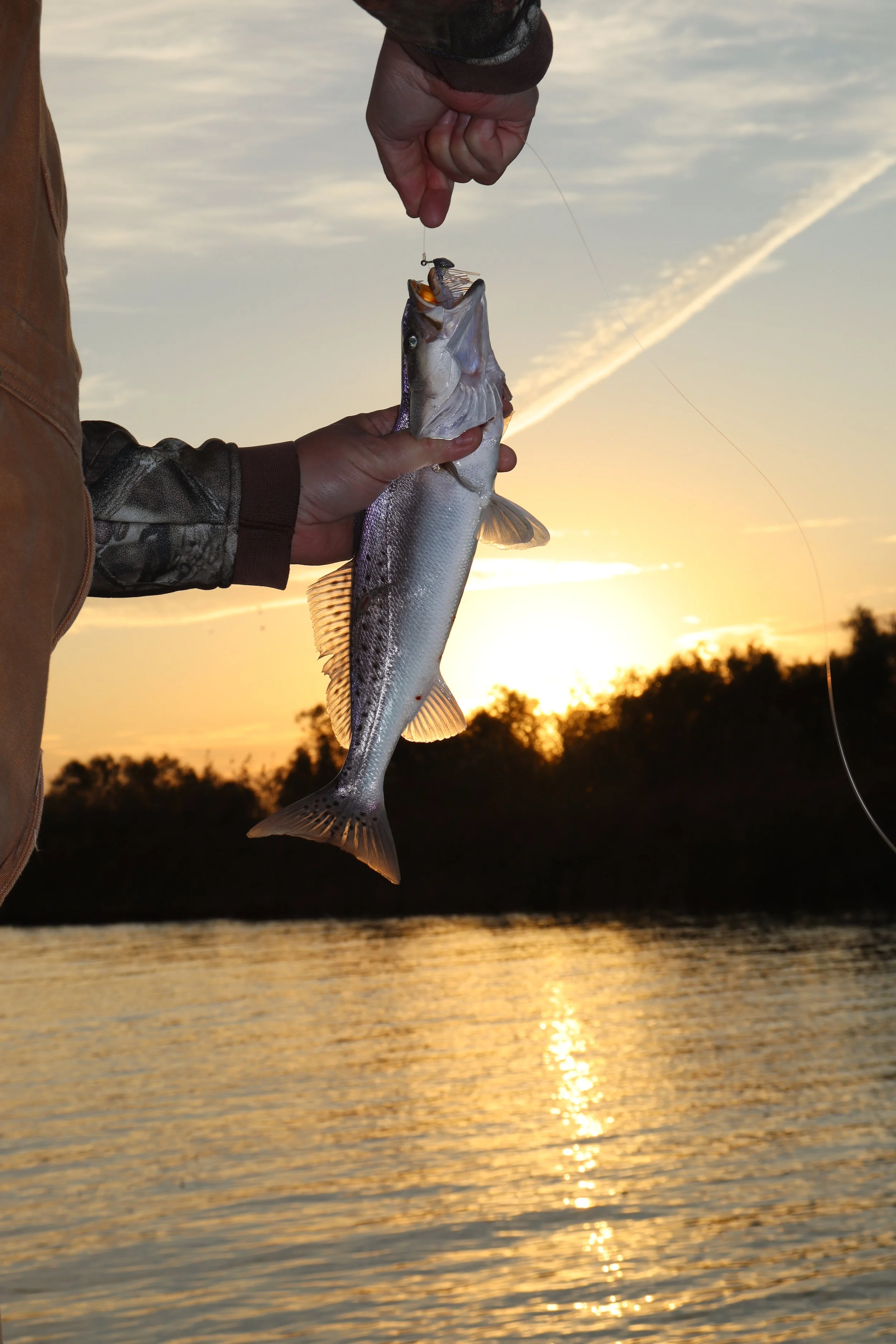 The sun started to turn the sky all shades of orange and violet as we neared our chosen pass. Before we could make the first cast earth’s star peeked above the reeds and grass on the East bank. It was a gorgeous dawn and expectations were high. Working up and down the pass we found consistent catches but would certainly need to fish the whole day to limit out. Curiously there was a boat that camped out at the mouth of the pass the entire time we motored back and forth. Drifting a little closer to the stationary fishermen, Kenny casted to the opposite bank we had been fishing, towards a mud flat. From that point forward the trip went from great, to unbelievable. Those of us occupying Tim’s boat couldn’t help but catch trout. Never had I seen anything like it, nor may I ever again.