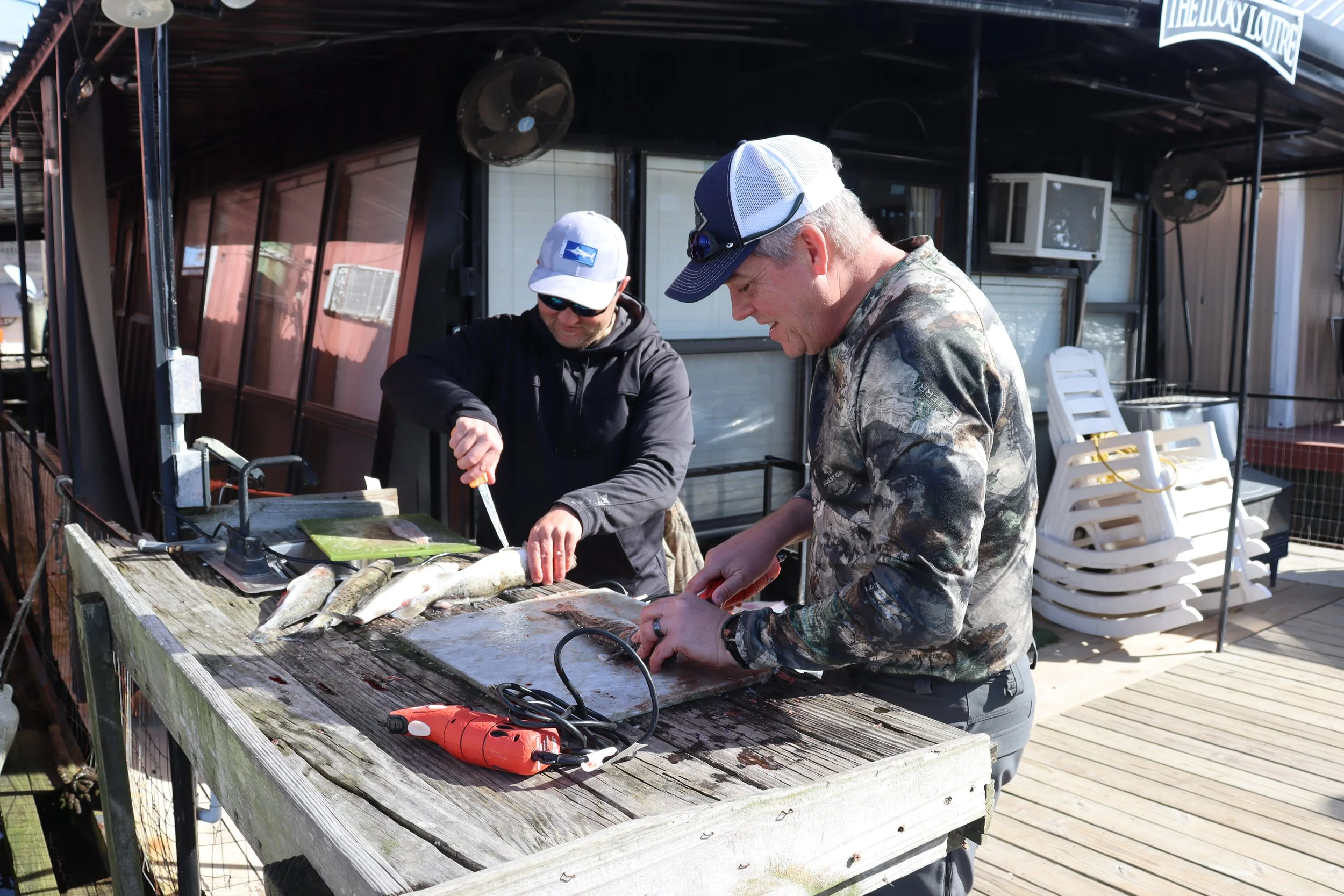 Idling through the marina, it was an aquatic based community. House boat after house boat stacked like there should be a cul-de-sac at the end. We docked the boat at our back porch realizing the only people around were either duck hunters or fishermen. Dog shit littered the docks from the duck dogs and questionable ramps led to each domicile. As the rain moved back in, the three of us cleaned fish under the front awning at one of the two provided fish cleaning stations on our small rental. Did I mention that this was a sportsman’s paradise?